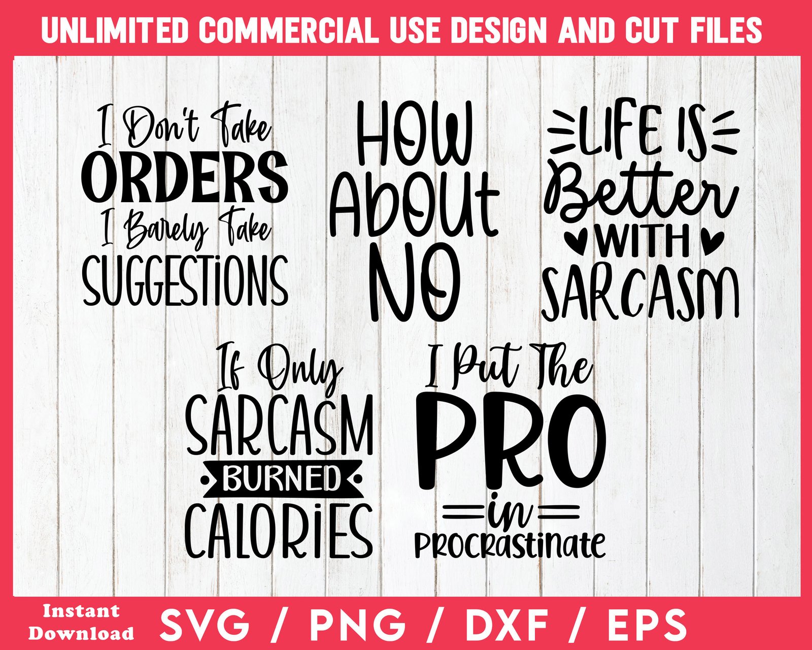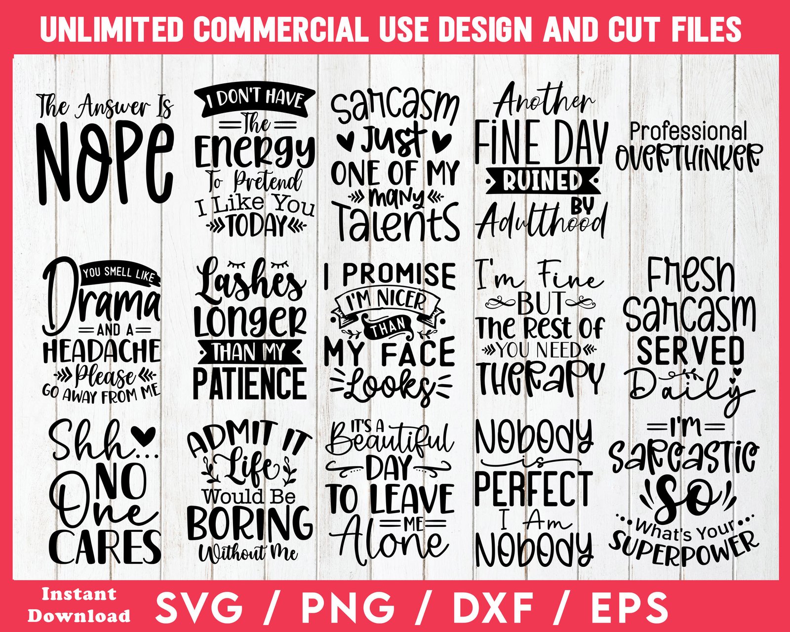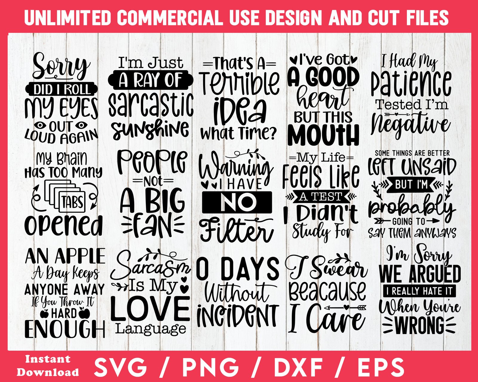 Free SVG And PNG Bundle Of 50 Funny Sarcastic Design Cut Files And Print On Demand Designs. Plus Comes With Full Commercial License To Use The Designs For Any Print On Demand Product You Want To Sell. Plus You Can Sell The Digital Design Files Themselves To Crafters, POD Sellers And More - A Mega Plus.